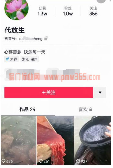 1:主页挂上微信,写上xx代放生,反正就是让他们加微信,让他们转账,第二天你以他的名义代放生。放生的过程中拍视频,配上一段说辞,比如:“xx 你叫我代放生的 三条鱼,今天帮你放生了,接好运” 。这样其他人刷到你视频就知道你会帮人代放生,自然也会联系你,这些流量会很精准。买一条鱼成本十块二十块,你收别人88元、168元都行。