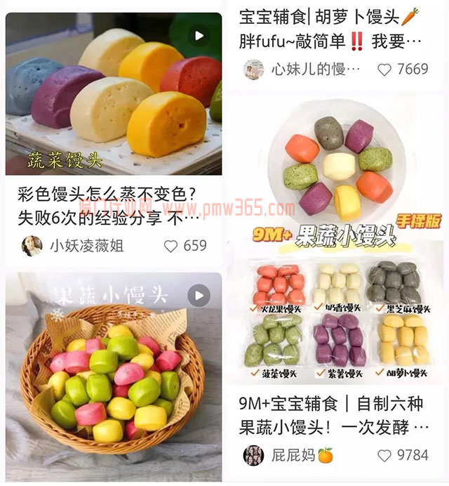 把蔬菜水果榨汁用来和面,然后做成五颜六色的馒头,形状花式可以不做特殊处理,但主打日常和健康的概念,特别吸引小朋友和宝妈这样的群体。