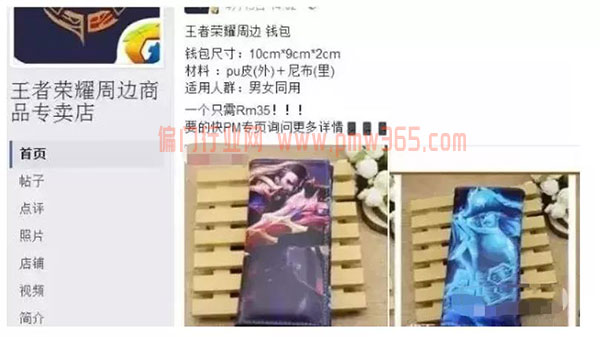 有一次我浏览facebook时,偶然发现马来西亚的一个账号居然在卖王者荣耀的周边产品,出于好奇心,我又看了一下他的其他资料,中国人无误!上面标价一个钱包是RM35,邮费是RM15 。马上查了一下汇率,一马币兑换1.6435 按照1.6算。
