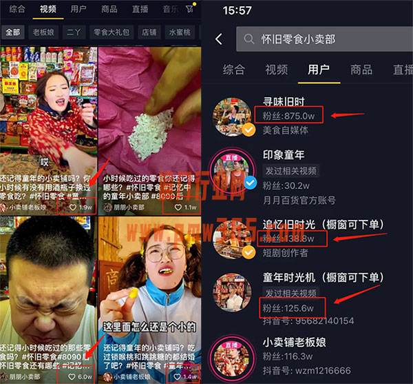 这些是抖音上的一些商家,他们就是利用8090的风格吸引流量,点赞量很高,都在几万到几十万。